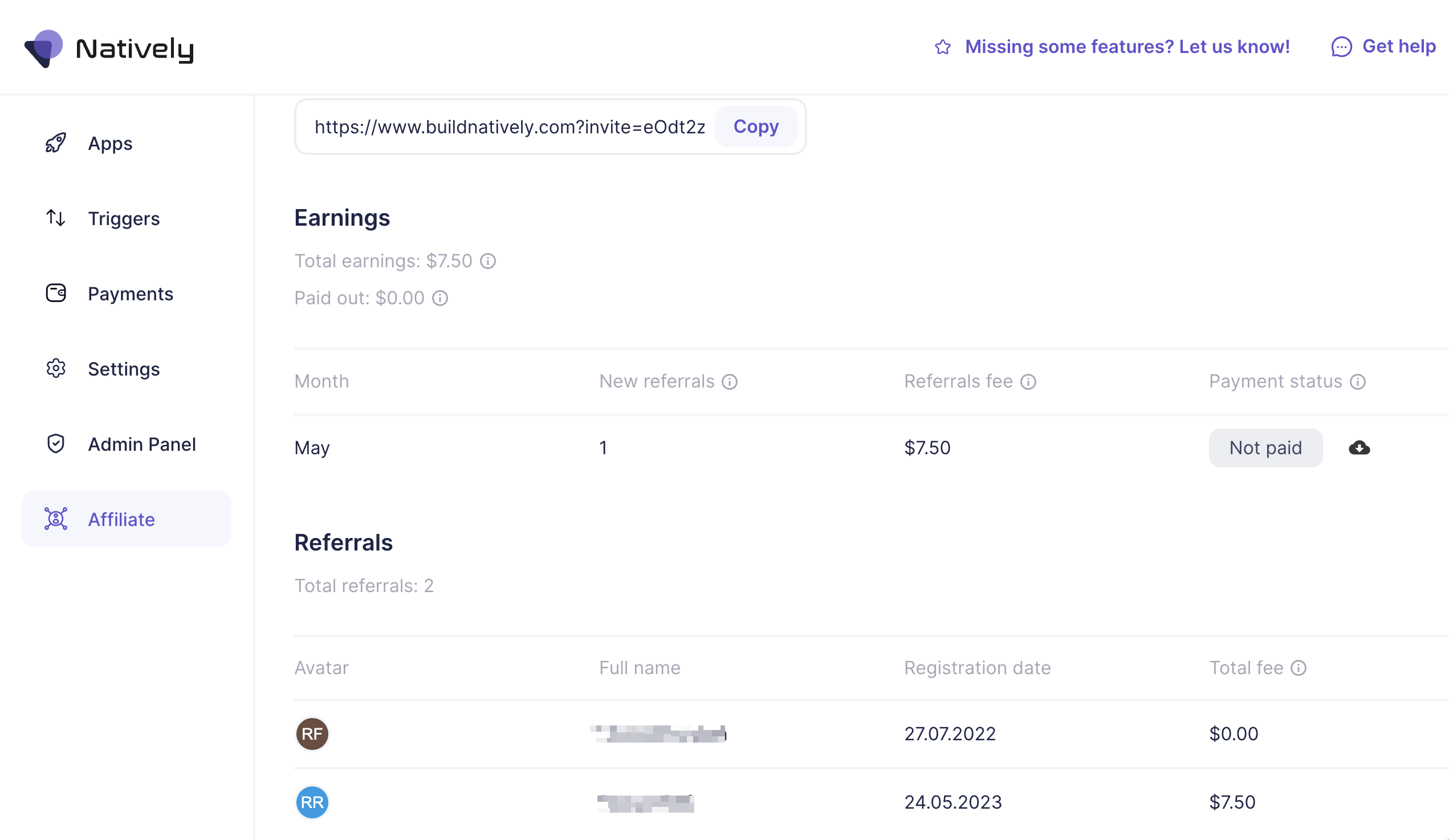 2\) Navigate to the [Affiliate page](https://app.buildnatively.com/?tab=affiliate)