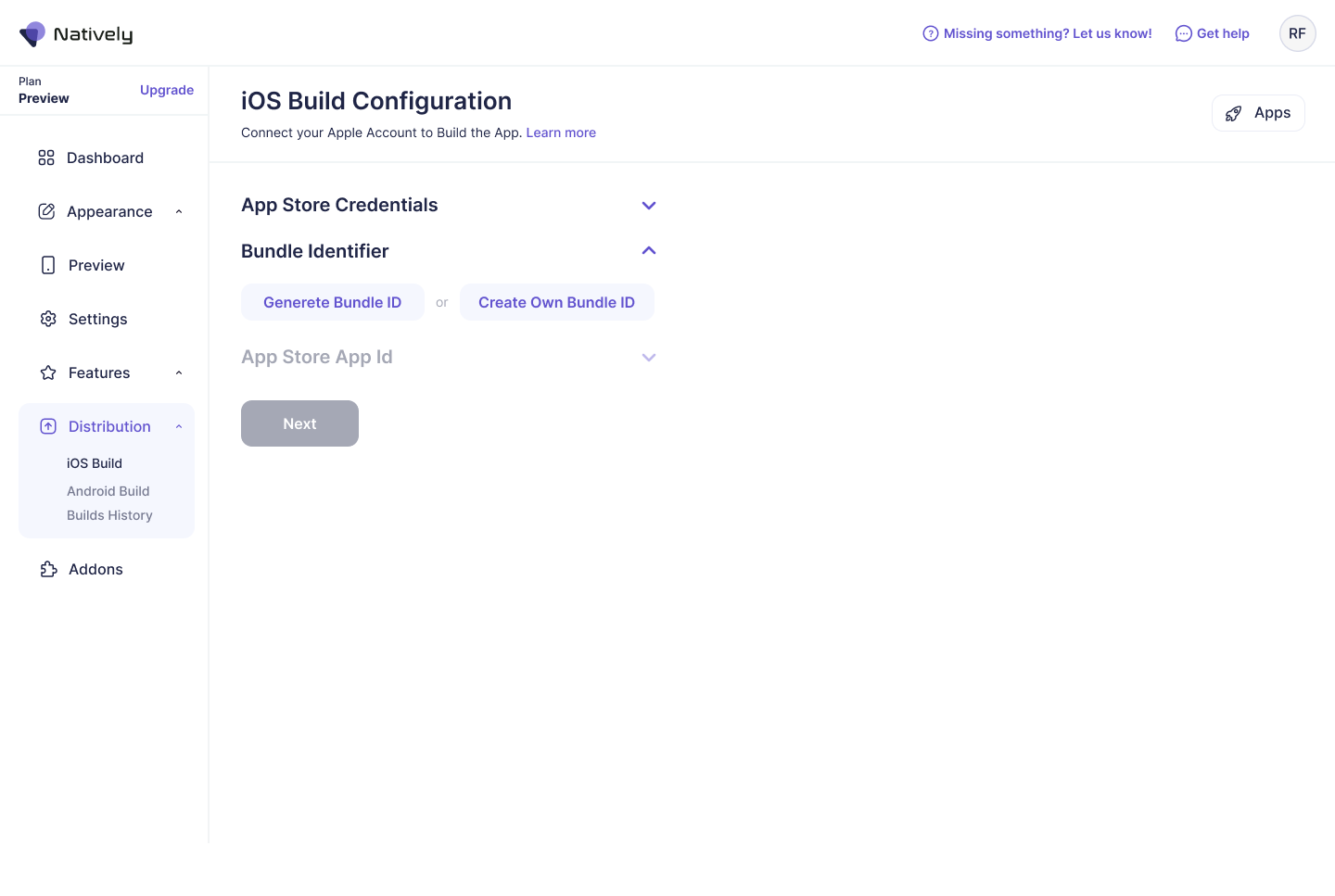 The Bundle Identifier is a unique identifier for your app. Once set, it can only be changed if your app or developer account is suspended. Please find more details in our [FAQ](https://docs.buildnatively.com/getting-started/faq#how-do-i-change-my-app-ios-or-android-bundle-id-bundle-identifier)