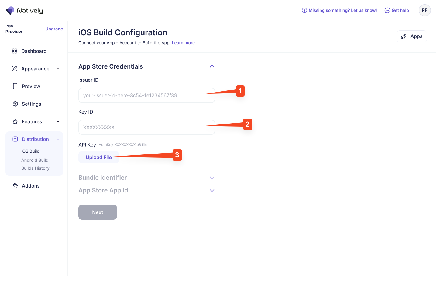 * Return to our platform and fill the **Bundle Identifier** field with Bundle ID (Note: **No need to copy** App ID Prefix it's not [App Store App ID](#app-store-app-id))
